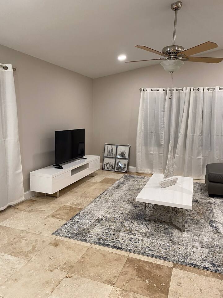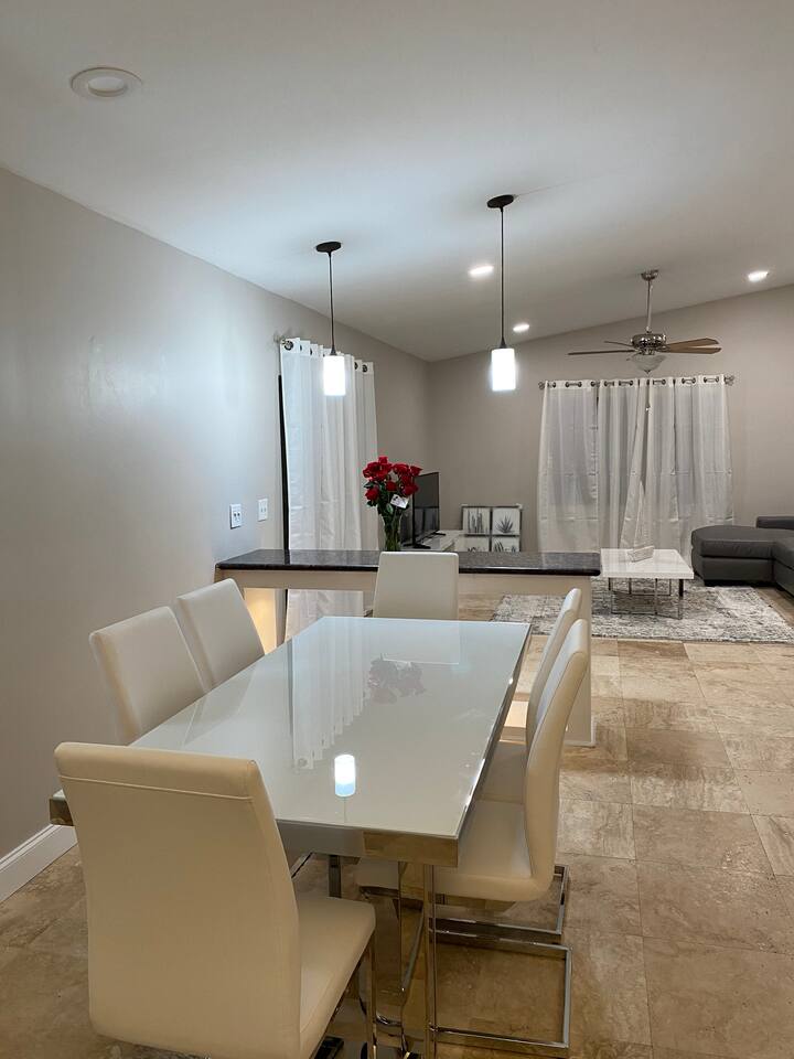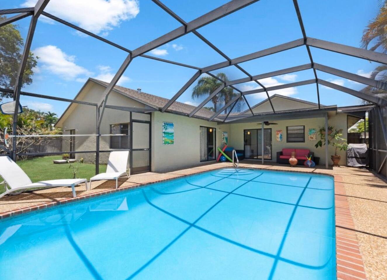 Tropical paradise in the heart of Boca Raton. Stunning 3 bed/2 bath. Sleeps family of 9 to 11 people. New, remodeled bathrooms, House is modern and beautifully appointed. Beds are amazingly comfortable. Excellent high speed WiFi, Brand new internet TV's with lots of channels of Xfinity entertainment, Beautiful delicious HEATED swimming pool with safety gate. Extremely private fenced in backyard. Private park access for local residents. Game room complete with fuze ball and ping pong table. Enjoy the just a few minute walk away with a fountain as well as take a stroll on the path. Relax in the backyard with lounge chairs, patio, table/chairs, reclining pool chairs, and a new BBQ to grill up some tasty treats! Brand new flat screen TVs throughout the house. Beautiful kitchen, granite counter-tops stocked with pots and pans, Keurig coffee maker (with complimentary K cups), toaster oven, oven/range, and service for 8. For security purposes, house is equipped with Ring camera/doorbell which views exterior of front door and driveway. Family friendly, pac n play, high chair. 5 mile from the beach. Short drive to Town Center Mall. Close to restaurants, FAU/Lynn University, The Addison of Boca Raton, Patch Reef Park, Sugar Sand Park, Spanish River Park and library. You will absolutely love staying here!!!!